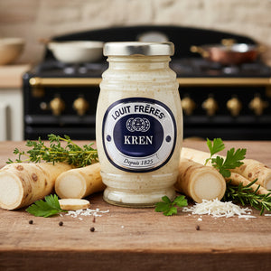 Louit Frères Kren este o cremă fină de hrean cu gust intens, obținută din rădăcină de hrean proaspăt și ulei de rapiță, echilibrată cu o notă subtilă de brandy pentru rafinament. Rețetă tradițională, potrivită pentru a însoți fripturi, mezeluri, pește afumat, brânzeturi sau legume fierte.