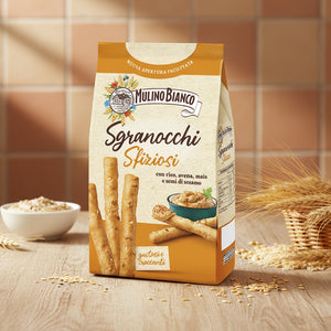 Grisinele Sgranocchi de la Mulino Bianco sunt un snack italian crocant și gustos, făcute din făină de grâu moale tip „0” și un amestec de cereale crocante cu semințe de susan, pentru o textură ușor crocantă și o aromă plăcută.