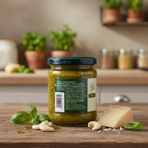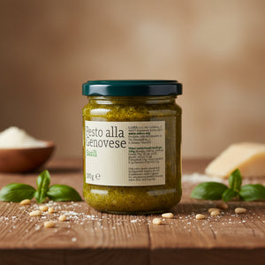 Un pesto cremos și aromat, făcut după rețeta originală genoveză, cu busuioc proaspăt, brânzeturi italiene DOP și ulei extravirgin de măsline. Ideal pentru paste, bruschette, sandwich-uri gourmet sau salate.