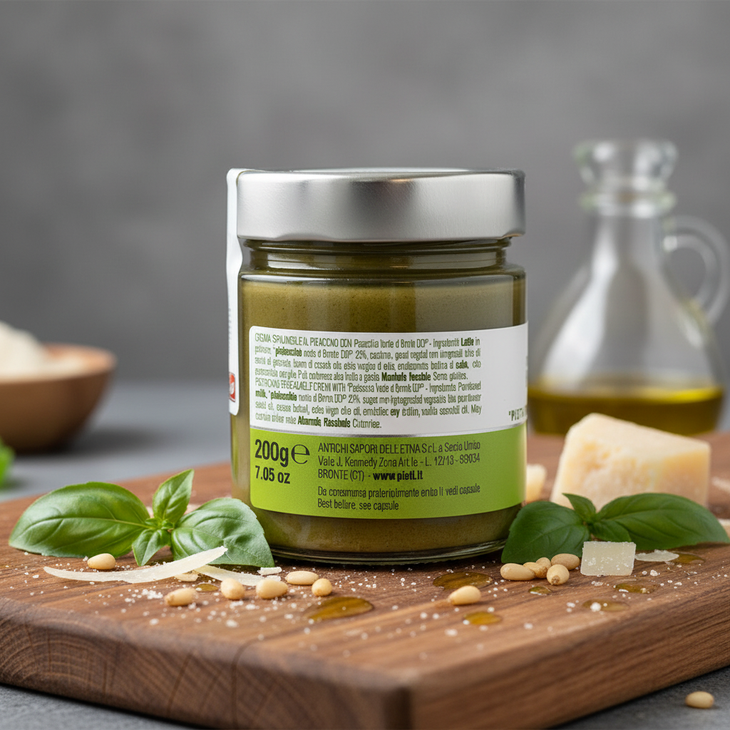 Fistic Verde di Bronte DOP (minim 60 %), zahăr, uleiuri vegetale (floarea-soarelui și/sau soia), emulsifiant (lecitină de soia), sare.